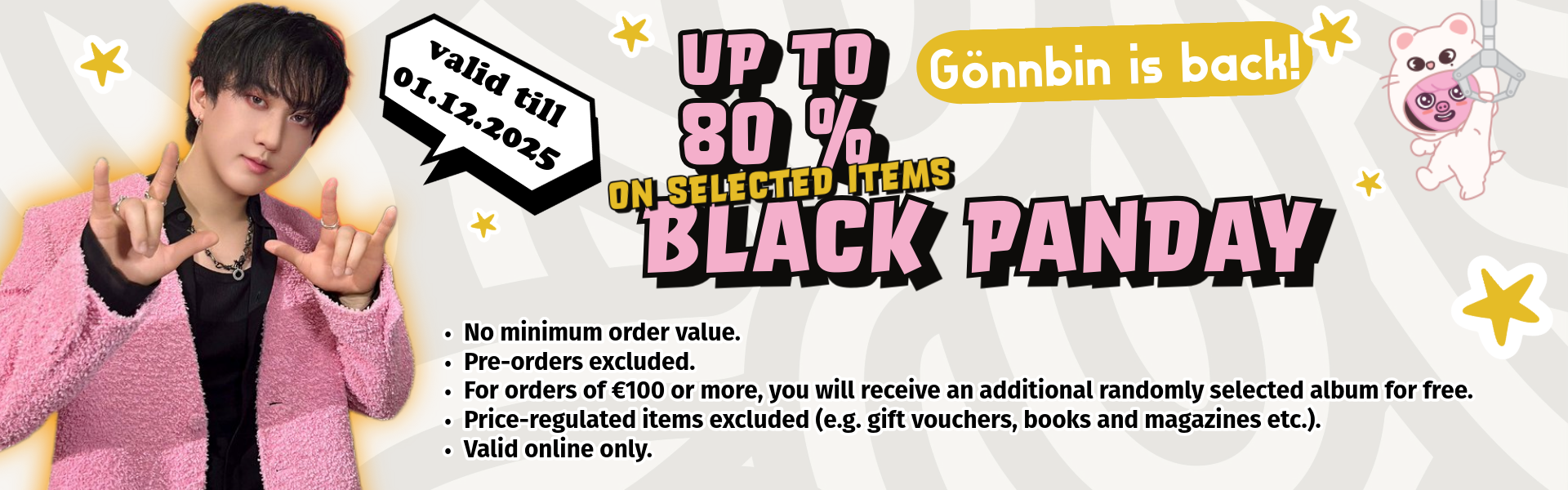 daebak_kpop_shop 🐼 BLACK PANDAY SALE🐼 Online: 28.11.2025 – 01.12.2025 Unser Panda ist aus dem Winterschlaf gekrabbelt, hat erstmal alles aufgefuttert, was nach Prozenten aussah… ähm, wir meinen: großzügig verteilt! 🤭 Von Freitag bis Montag könnt ihr auf ausgewählte Artikel bis zu 80% sparen! 🖤🔥 Aber unser Panda ist nicht nur verfressen – er ist auch spendabel: Neben den Rabatten online, schenkt unser Gönnbin ab 100 € Warenwert euch zusätzlich ein random GRATIS Album! 🎁💿 Quasi ein frühzeitiges Weihnachtsgeschenk von ihm, oder uns… oder ein „Hups, das ist mir wohl in euren Warenkorb gefallen“-Moment. 🎄😌 Also: Klickfinger lockern, Warenkorb mästen und dem Black Panday huldigen. 🐼💸 *️⃣ Ausgeschlossen: Pre-Orders, Gutscheine & Artikel mit Preisbindung Nur online gültig. Gratis random Album ab Warenwert von 100€ nur online gültig. #daebak #blackfriday #kpop #daebakgermany #jyp #jypapi #changbin #straykids #skz #ffm